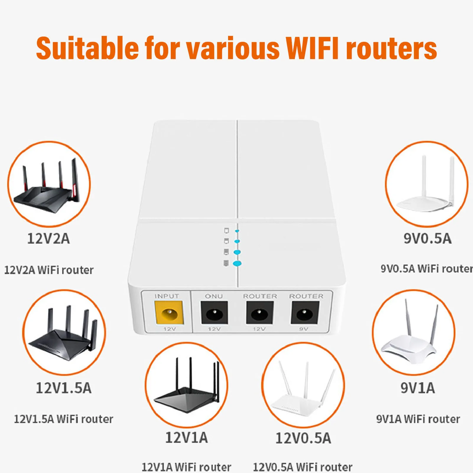 2. PORTS POLYVALENTS : Ports de sortie du Mini UPS DC pour 2 x DC 2A maximum, DC 1A maximum, modèle de sortie DC 5.5x2.1mm, supporte tout courant inférieur à 2A. Non seulement vous pouvez alimenter votre routeur et modem, mais vous pouvez aussi charger rapidement votre tablette et téléphone.