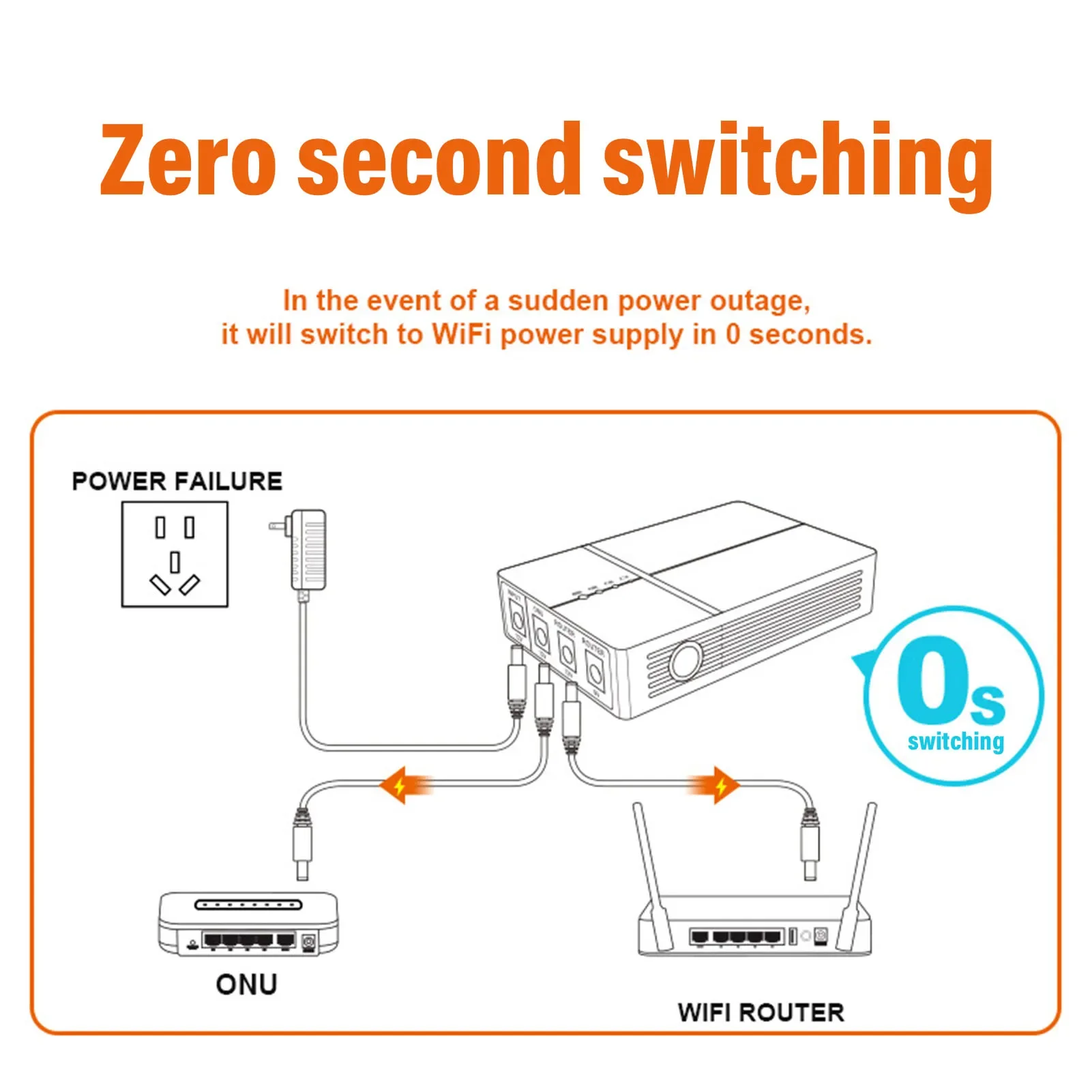 1. ALIMENTATION SANS INTERRUPTION : Le mini onduleur fournit une alimentation continue lors de la commutation du système électrique et maintient la connexion WiFi. La capacité est de 6000mAh et peut alimenter le routeur et le modem (24W) jusqu'à 5 heures. Équipé d'un câble DC 5.5x2.1mm un vers deux.